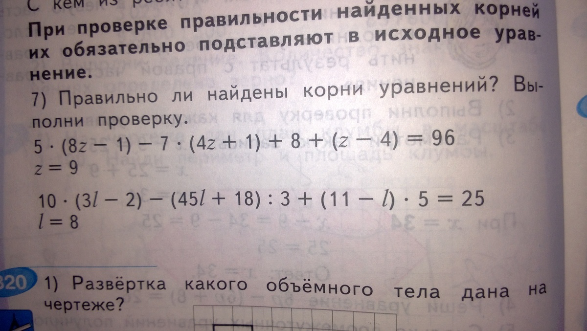 пожалуйста помогите!Правильно ли найдены корни уравнений?Выполни проверку!5*(8z-1)-7*(4z+1)+8+(z-4)=96z=9 помогите прошууууу!первое уравнение