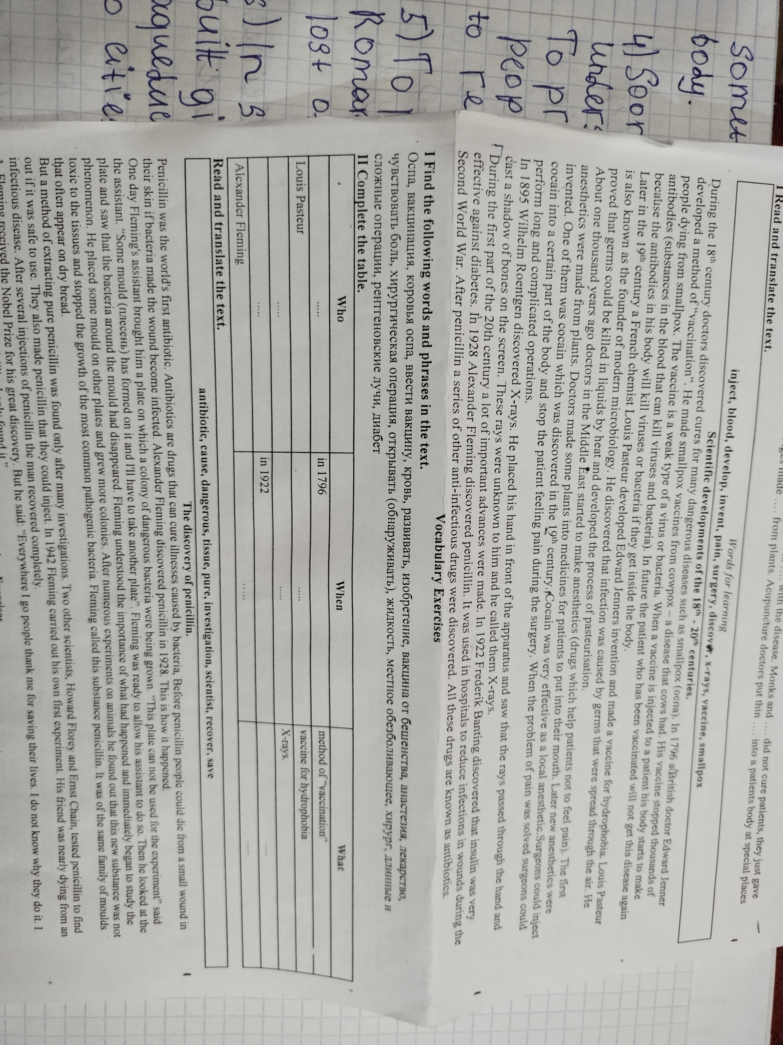 Ответ:Who: Edvard Jenner;Louis Pasteur; Wilhelm Roentgen; Frederick Banting; Alexander Fleming;