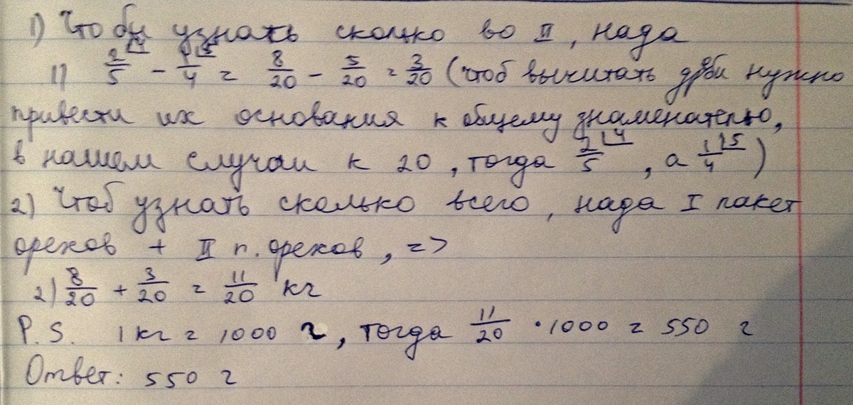 в одном пакете 2/5кг орехов, а в другом на 1/4кг меньше. сколько орехов в двух пакетах?ответ выразите в граммах. Можете помочь ПОЖАЙЛУСТА