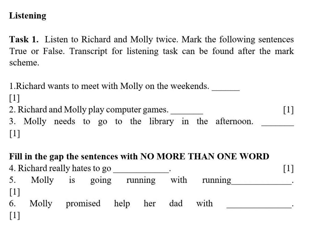 Task 1. Listen to Richard and Molly twice. Mark the following sentences True or False. Transcript for listening task can be found after the mark scheme.