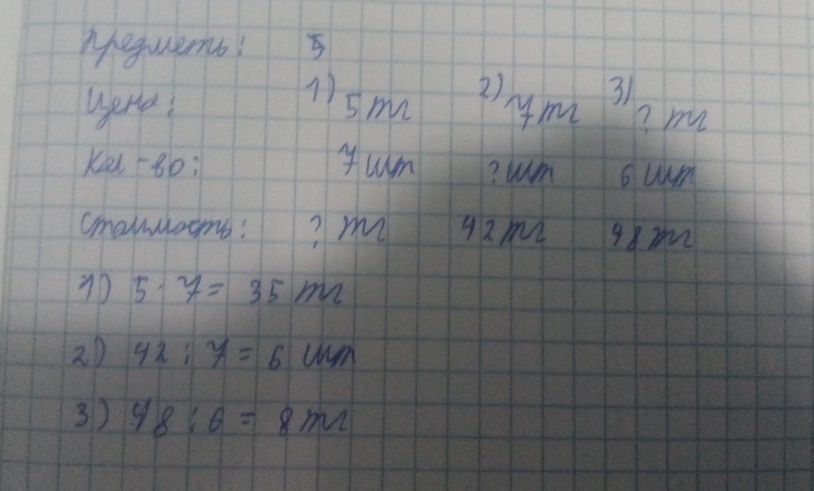 Предметы Цена 5 тенге 7 тенге ? тенге Количество 7 шт. ? шт. 6 шт. Стоимость ? тенге 42 тенге 48 тенге