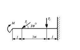 2. Визначити опорні реакції балки. Дано: F1 = 10H; F2 = 12H; M=4Н·м.