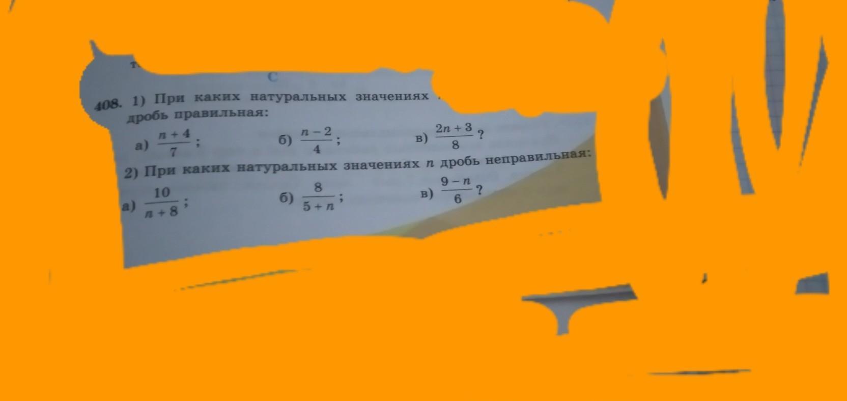 408. 1) При каких натуральных значениях дробь правильная: a) 6) В) 8 2) При каких натуральных значениях п дробь неправильная: 10 9-n a) б) B) 6 n+8 n+4 7 n-2 4 ; 8 ; 5+ п 2n + 3 ? ?Даю 100 баллов