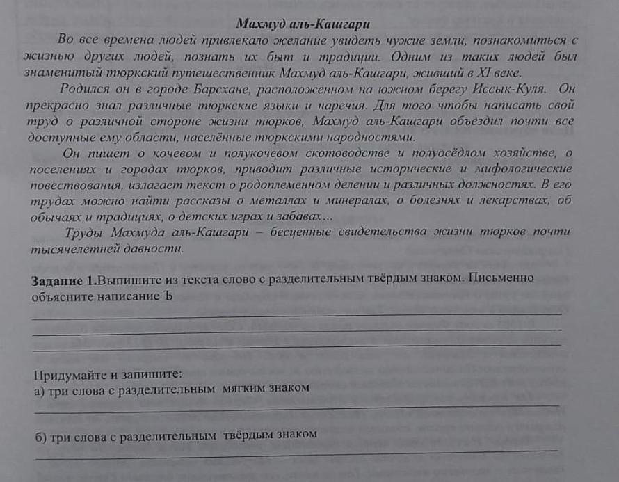 Махмуд аль-Кашгари Во все времена людей привлекало желание увидеть чужие земли, познакомиться с жизнью других людей, познать их быт и традиции. Одним из таких людей был знаменитый тюркский путешественник Махмуд аль-Кашгари, живший в XI веке. в Родился он в городе Барсхане, расположенном на южном берегу Иссык-Куля. Он прекрасно знал различные тюркские языки и наречия. Для того чтобы написать свой труд о различной стороне жизни тюрков, Махмуд аль-Кашгари объездил почти все доступные ему области, населённые тюркскими народностями. Он пишет о кочевом и полукочевом скотоводстве и полуосёдлом хозяйстве, о поселениях и городах тюрков, приводит различные исторические и мифологические повествования, излагает текст о родоплеменном делении и различных должностях. В его трудах можно найти рассказы о металлах и минералах, о болезнях и лекарствах, об обычаях и традициях, о детских играх и забавах... Труды Махмуда аль-Кашгари бесценные свидетельства жизни тюрков почти тысячелетней давности. Задание 1.Выпишите из текста слово с разделительным твёрдым знаком. Письменно объясните написание ъ Придумайте и запишите: а) три слова с разделительным мягким знаком б) три слова с разделительным твёрдым знаком