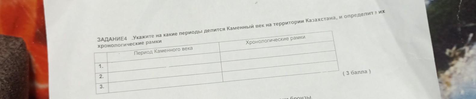 ЗАДАНИЕ4 Укажите на какие периоды делится Каменный век на территории Казахстана, и определите их хронологические рамки Период Каменного века Хронологические рамки 1. 2. 3. (3 балла) заполните таблицу что бы было понятно