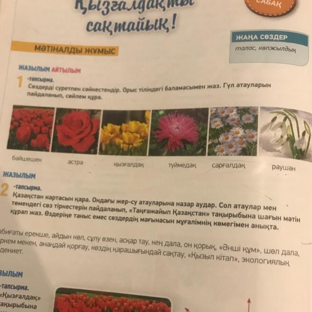Бәйшешек—шафран, астра—астра, қызғалдақ—тюльпан, түймедақ—ромашка, сарғалдақ—лютик, раушан—розовыеБәйшешек күн жылынып, көктемнің келе жатқанын алғаш хабарлайтын күй талғамайтын гүл. Астра сәндік мақсатта өсіріледі. Құлпырған қызғалдақтар жер анаға сән берді. Тіс ауырғанда түймедақ шайы ауырғанды басады. Біз құрбылар болып, тау етегіне сарғалдақ теруге шықтық. Менің досым анасын әр мейрам сайын раушан гүлін беріп қуантып отырады.