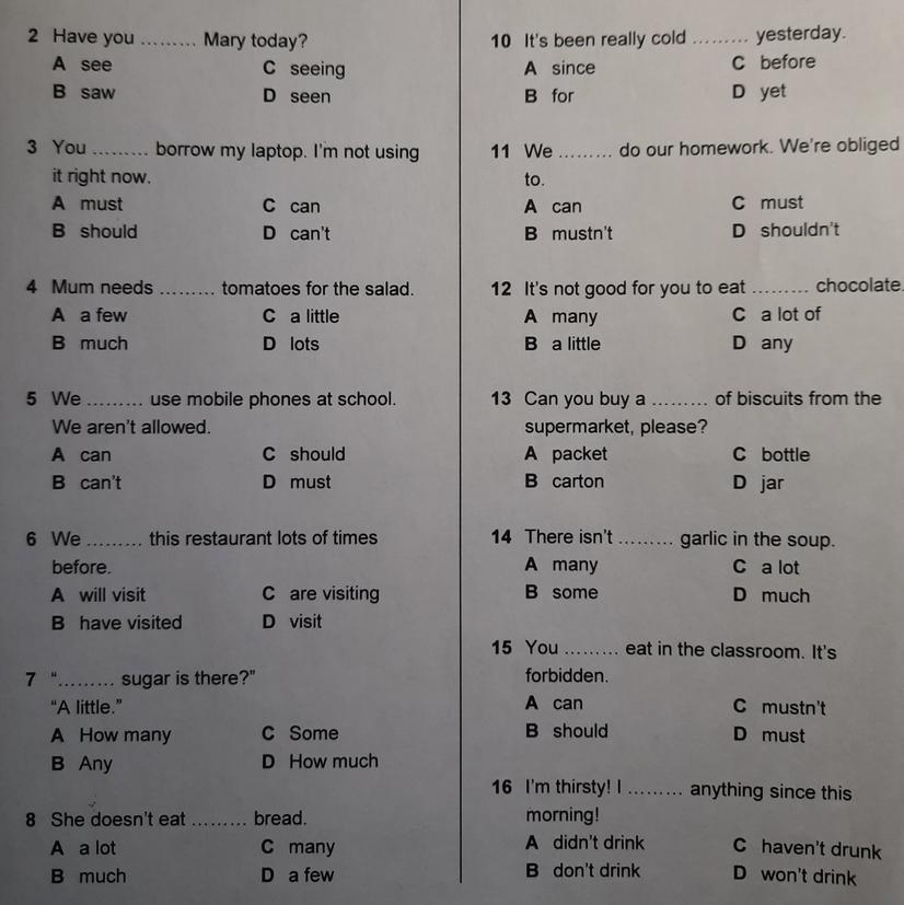 - c) mustn't