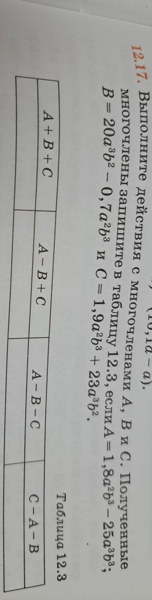 12.17. Выполните действия с многочленами А, В и С. Получе многочлены запишите в таблицу 12.3, если А= 1,8a²b³ - 25а ³; 20a³b² – 0,7a²b³ и C = 1,9a²b³ + 23a³b². A+B+C A-B+C A-B-C Таблица 12.3 С-А-В