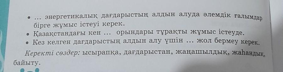 • Қазақстандағы кен ... орындары тұрақты жұмыс істеуде. • Кез келген дағдарыстың алдын алу үшін . жол бермеу керек. Керекті сөздер: ысырапқа, дағдарыстан, жаңашылдық, жаһандык, байыту.Пжпжпжпжп прям сегодня надо пжжпжп умоляюю пджпжпжпжпжп