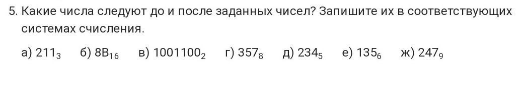 Какие числа следуют до и после заданных чисел? Запишите их в соответствующих системах счисления.