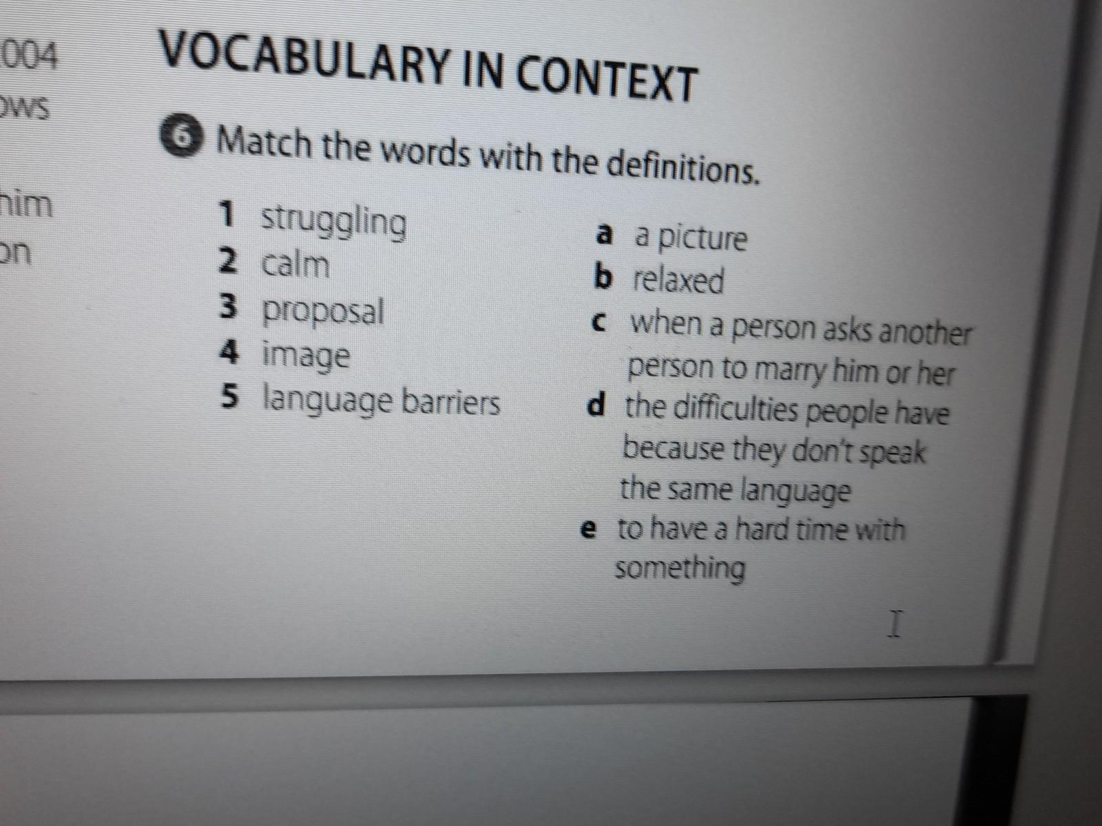 VOCABULARY IN CONTEXT 6 Match the words with the definitions. 1 struggling a picture 2 calm 3 proposal 4 image 5 language barriers a b relaxed c when a person asks another person to marry him or her d the difficulties people have because they don't speak the same language e to have a hard time with something I