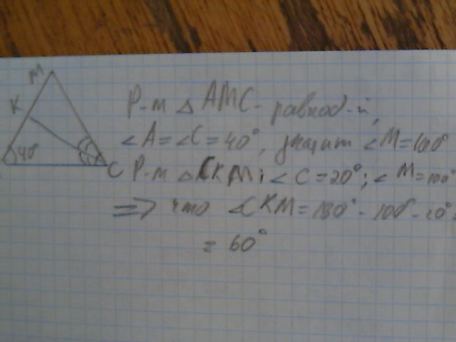В равнобедренном треугольнике AMC с. В равнобедренном треугольнике AMC соснованием AC проведена биссектриса CK Найдите угол CKM если угол A = 40 градусам