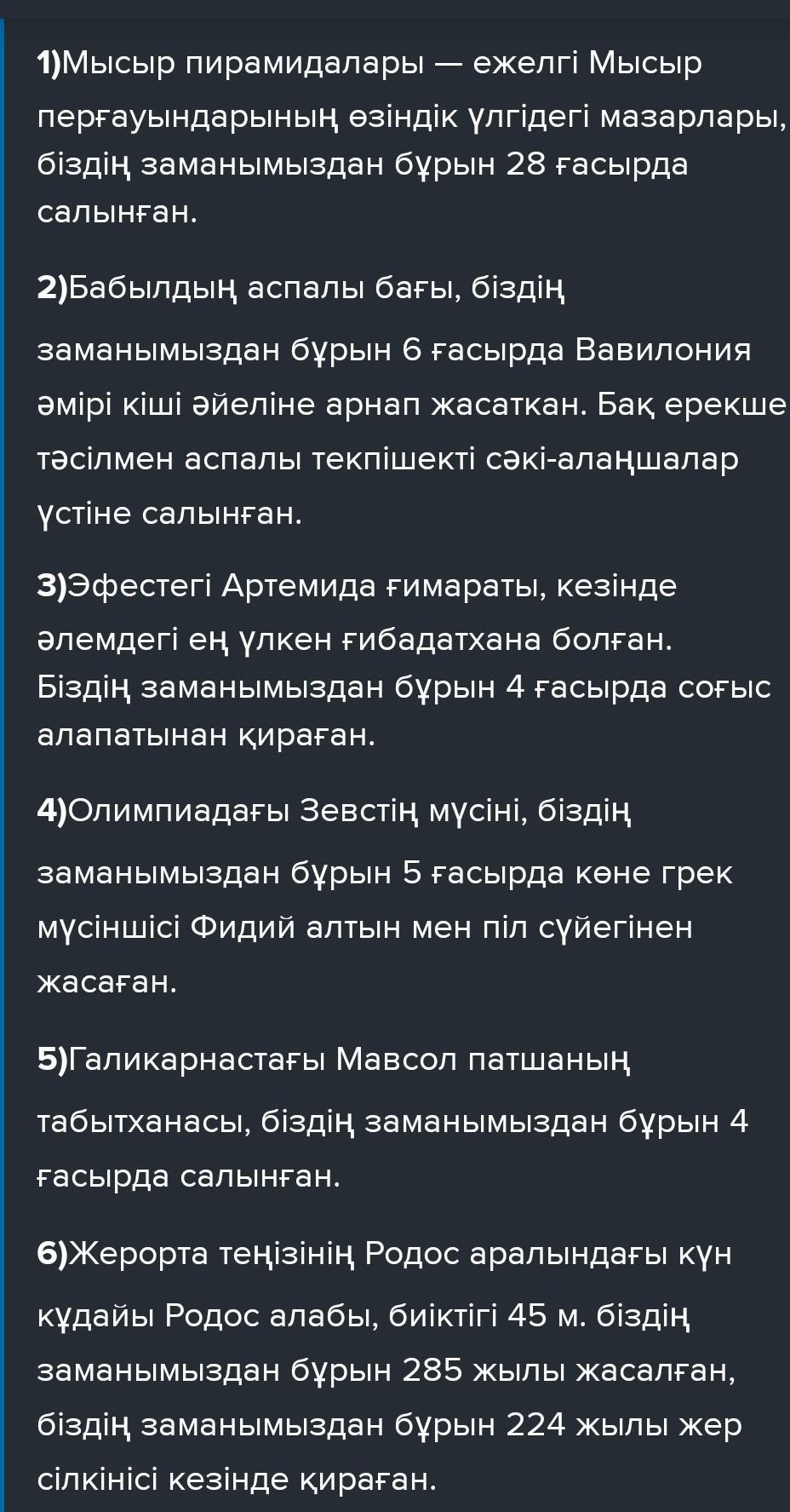 1)Мысыр пирамидалары — ежелгі Мысыр перғауындарының өзіндік үлгідегі мазарлары, біздің заманымыздан бұрын 28 ғасырда салынған.