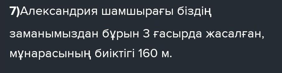 7)Александрия шамшырағы біздің заманымыздан бұрын 3 ғасырда жасалған, мұнарасының биіктігі 160 м.