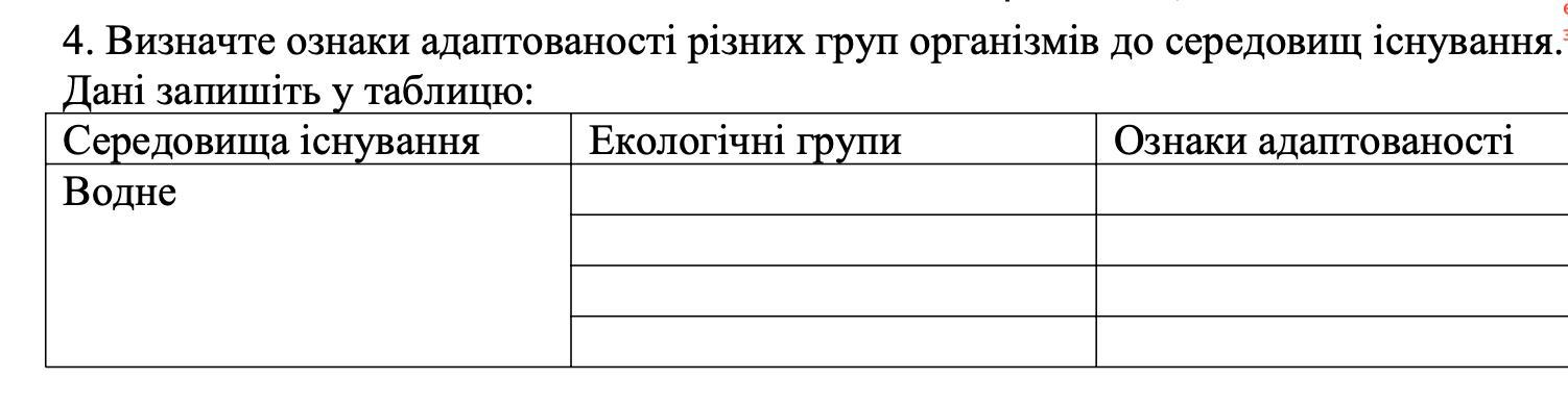 Визначте ознаки адаптованості різних груп організмів до середовищ існування. Дані запишіть у таблицю: