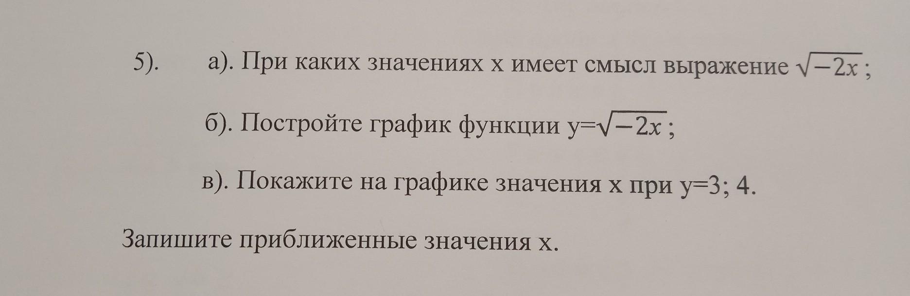 5). а). При каких значениях х имеет смысл выражение √-2x; б). Постройте график функции y=√-2x; в). Покажите на графике значения х при у=3; 4. Запишите приближенные значения х.