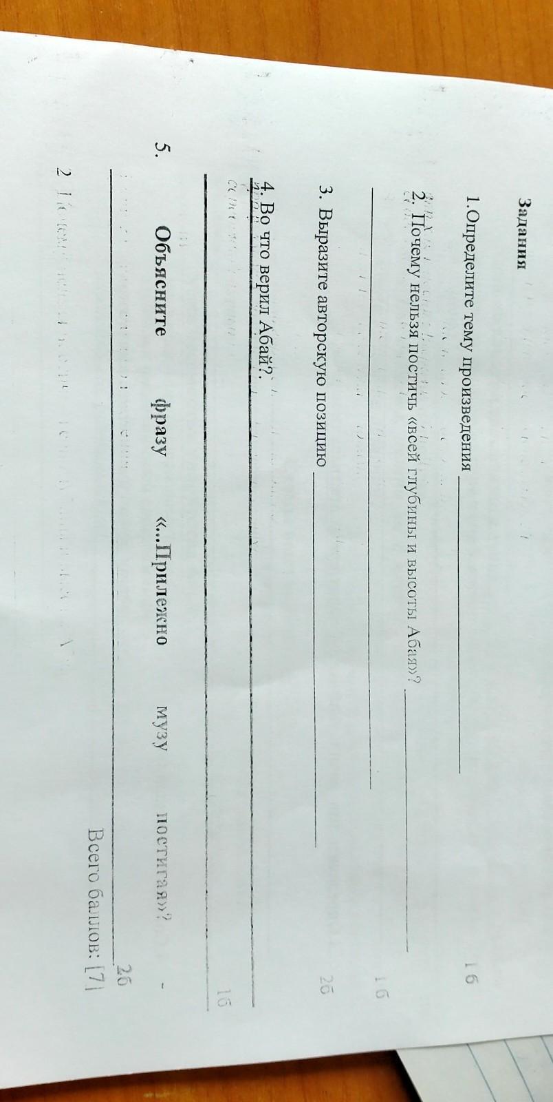 5. 1.Определите тему произведения 2612X41 2. Почему нельзя постичь «всей глубины и высоты Абая»? 3. Выразите авторскую позицию 4. Во что верил Абай?. иво в CLOU Объясните 2 По чем фразу «...Прилежно музу постигая>>? 16 20 16 20 Всего баллов: [7]