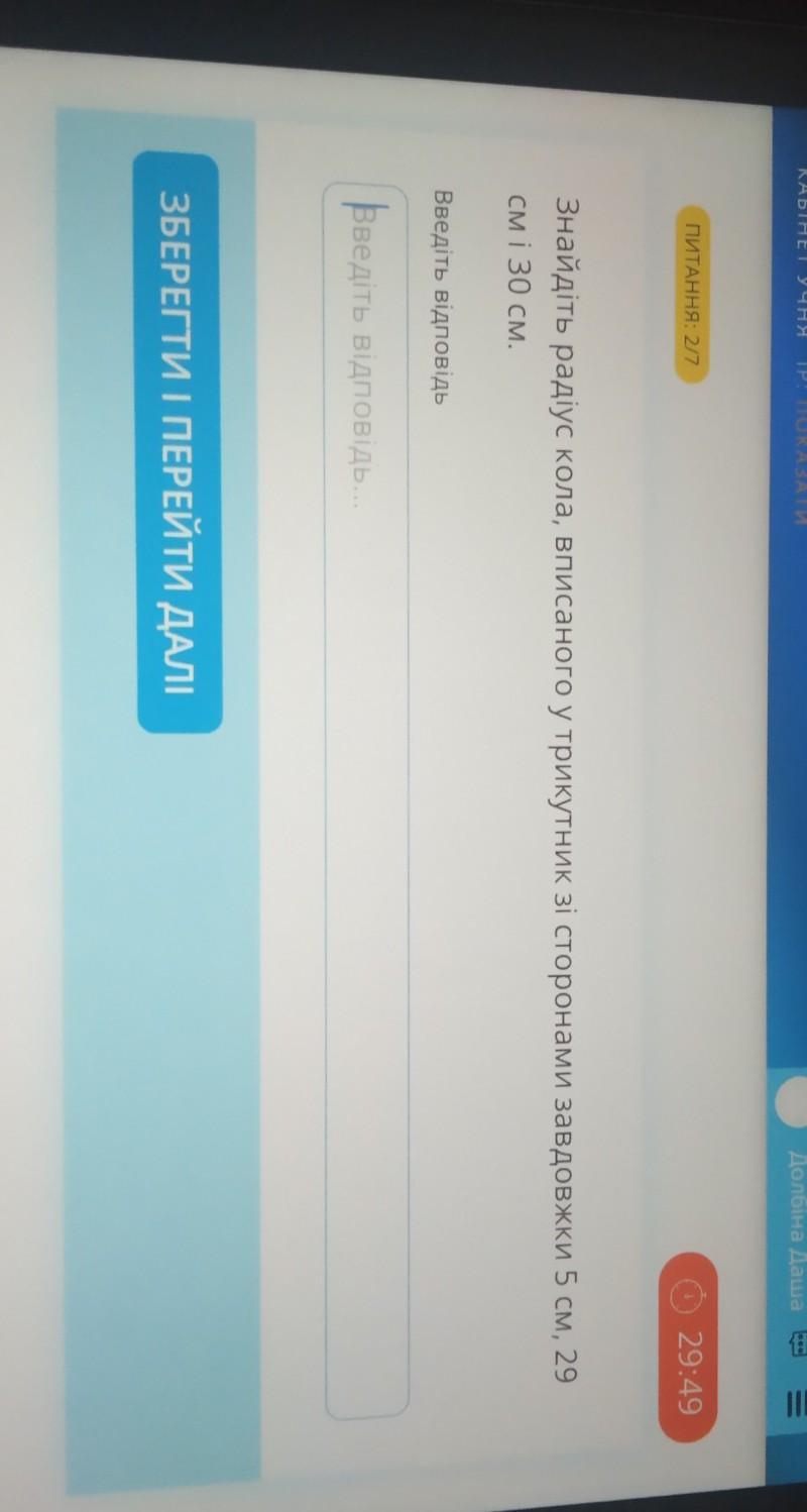 Знайдіть радіус кола, вписаного у трикутник зі сторонами завдовжки 5 см, 29 см і 30 см.