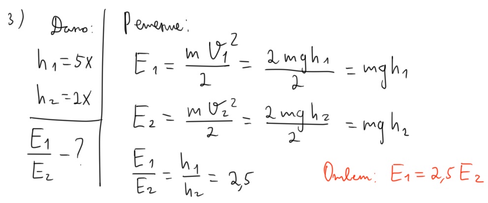 3)Шарики равной массы упали. Первый с пятого этажа, второй со второго. Сравните их энерги в момент падения на землю.