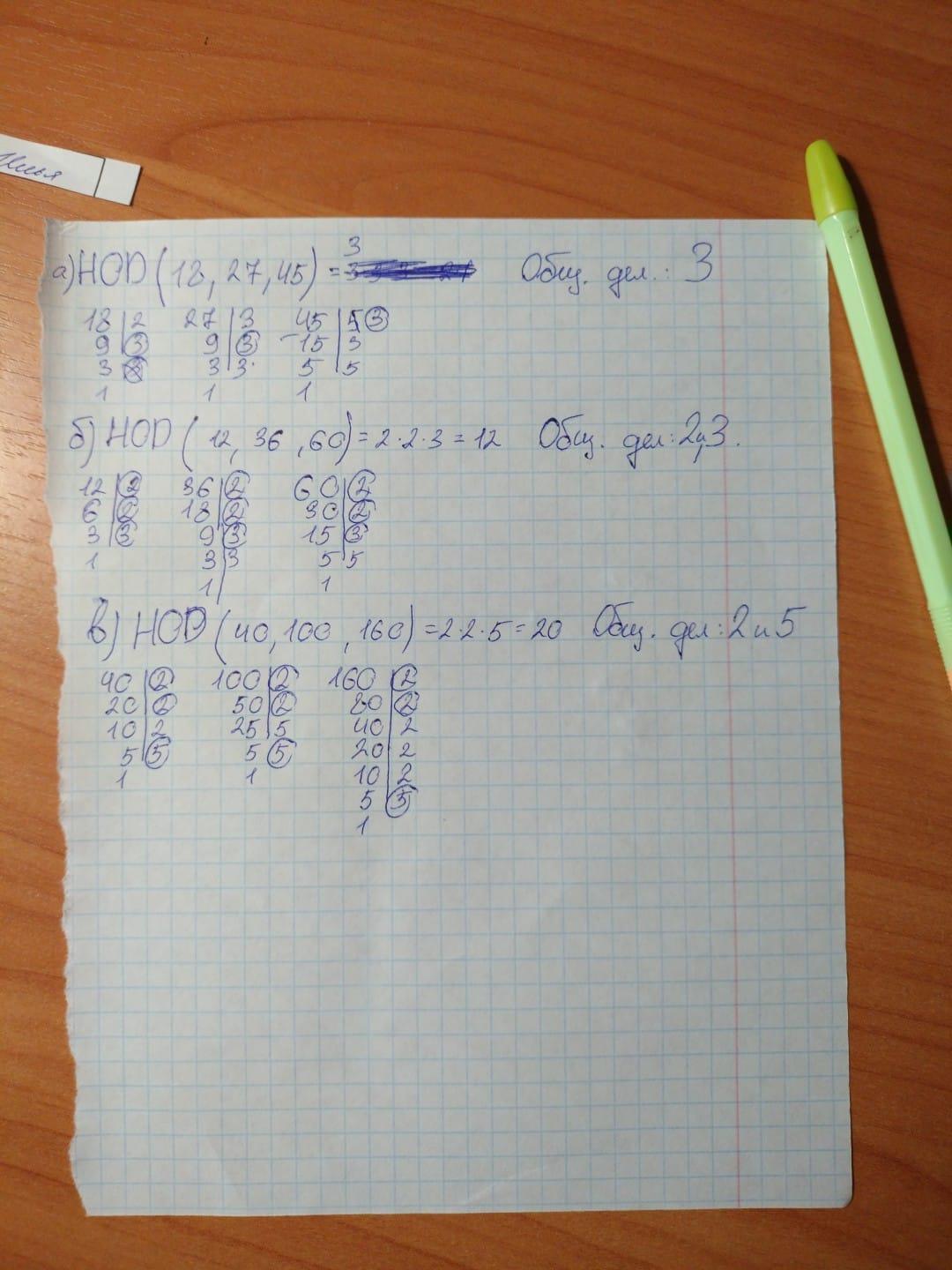 2) наибольший общий делитель этих чисел: 1) все общие делители данных чисел; а) 18, 27 и 45; 6) 12, 36 и 60; B) 40, 100 n 160.