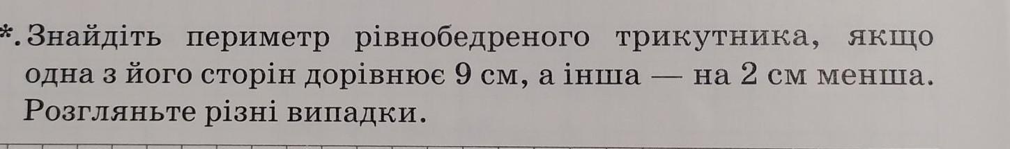 .Знайдіть периметр рівнобедреного трикутника, якщо одна з його сторін дорівнює 9 см, а інша на 2 см менша. Розгляньте рiзнi випадки. ―