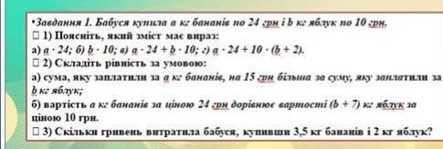a×24+10×(b+2) заплатила разом за банани і яблука, яких купила на 2 кг більше (b+2)