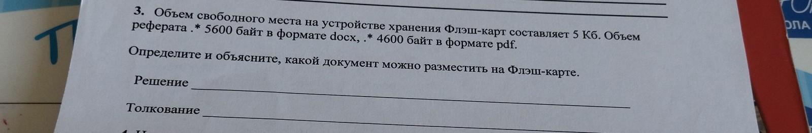 1 3. Объем свободного места на устройстве хранения Флэш-карт составляет 5 Кб. Объем реферата .* 5600 байт в формате docx, .* 4600 байт в формате pdf. В Определите и объясните, какой документ можно разместить на Флэш-карте. Решение Толкование