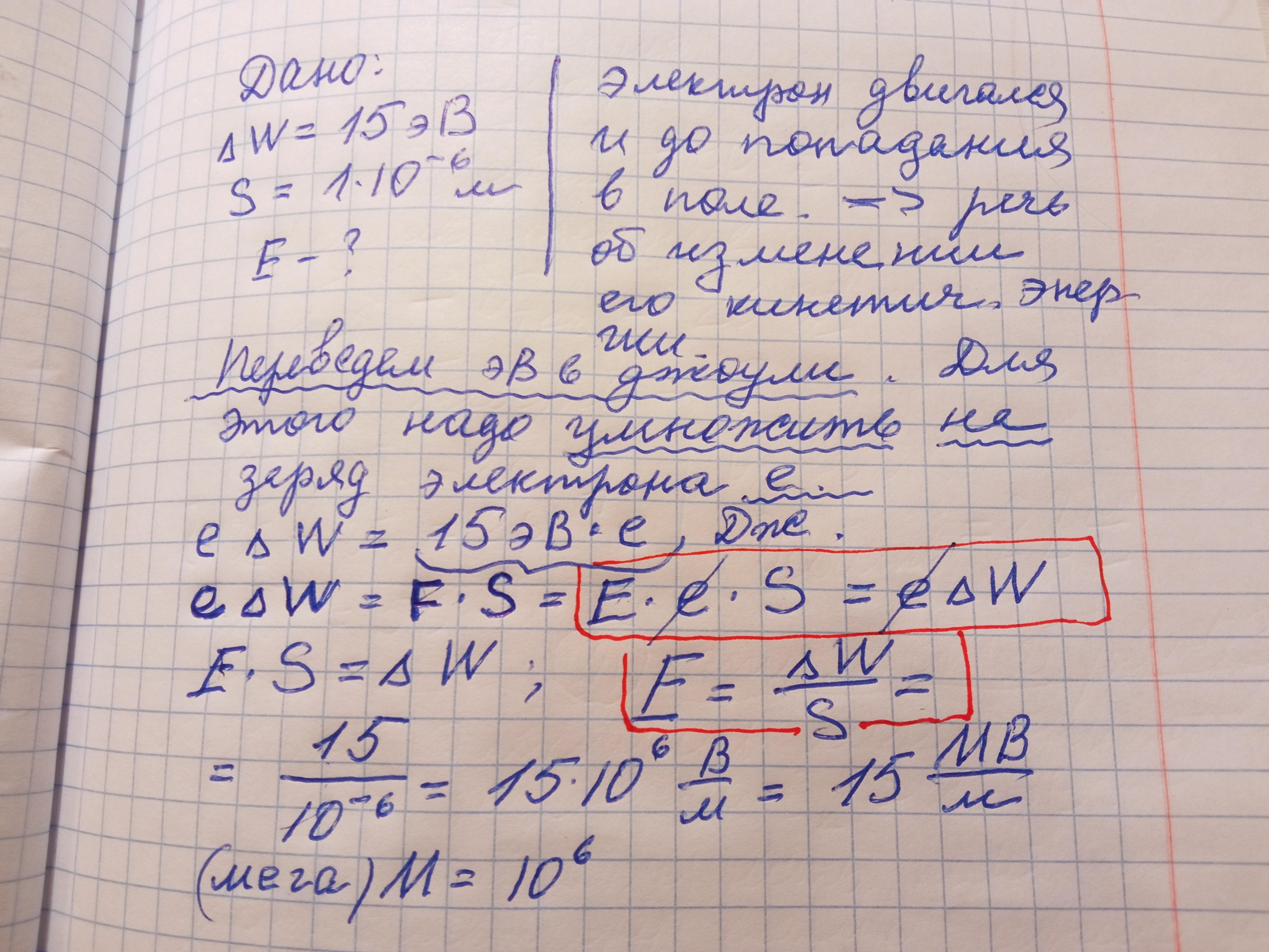 E=15 В*1,6*10^-19 Кл/1,6*10^-19 Кл*1*10^-6 м=15 В/1*10^-6 м(значення е скоротилися)=15*10^6В/м=15 МВ/м