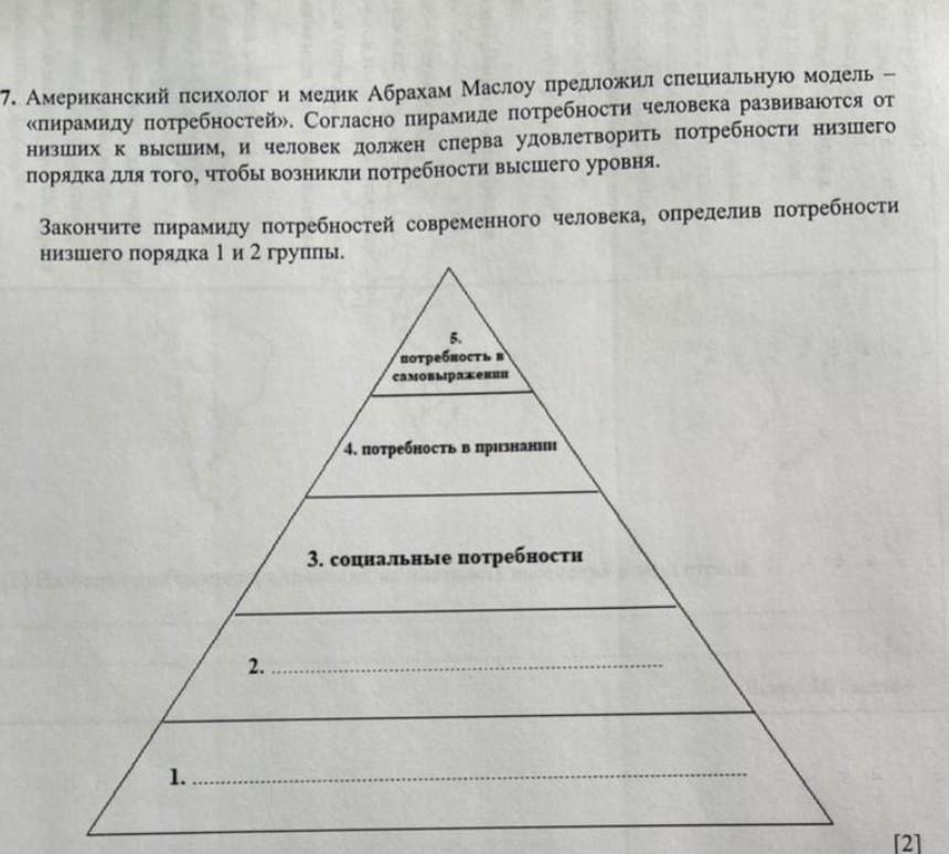 7. Американский психолог и медик Абрахам Маслоу предложил специальную модель «пирамиду потребностей». Согласно пирамиде потребности человека развиваются от низших к высшим, и человек должен сперва удовлетворить потребности низшего порядка для того, чтобы возникли потребности высшего уровня. Закончите пирамиду потребностей современного человека, определив потребности низшего порядка 1 и 2 группы.