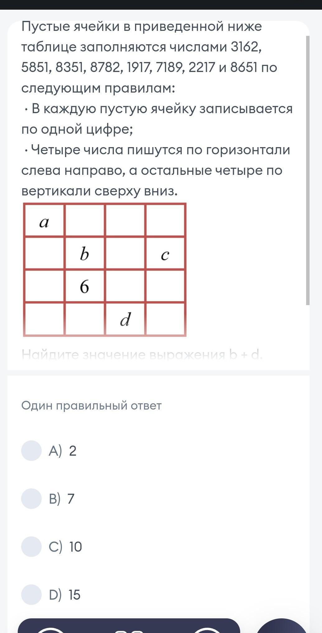 Ключ к решению - это число 3162, т.к. только там есть цифра 6 на месте десятков. Записываем в таблицу число 3162 сверху вниз, получаем, что b=1. Дальше, среди данных чисел, ищем число, у которого цифра сотен равна 2. Это число 2217. Вписываем его слева направо в нижнюю строку, получаем, что d=1.