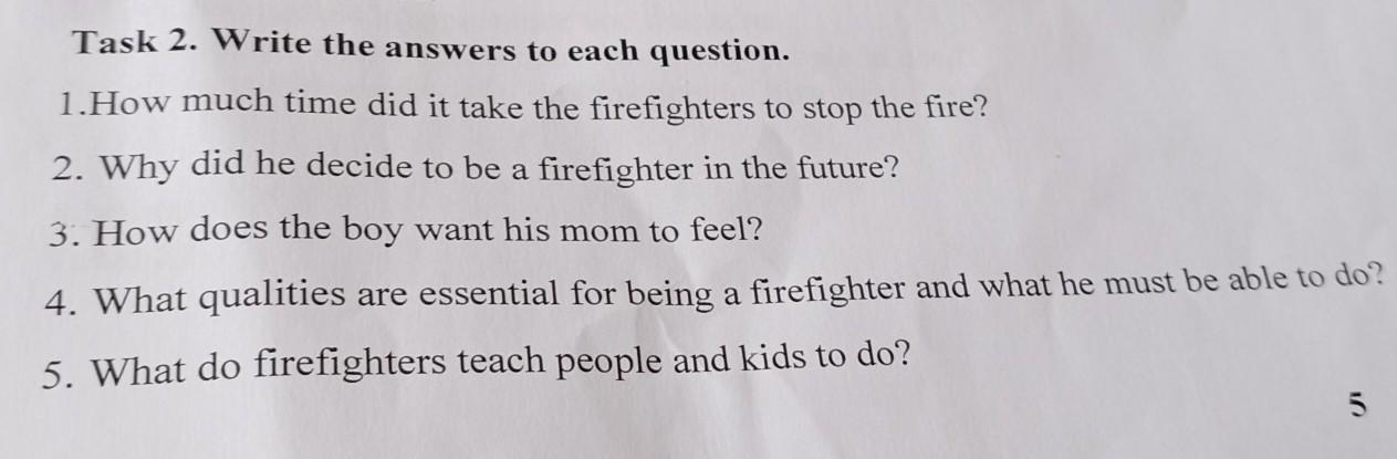 Task 2. Write the answers to each question. 1.How much time did it take the firefighters to stop the fire? 2. Why did he decide to be a firefighter in the future? 3. How does the boy want his mom to feel? 4. What qualities are essential for being a firefighter and what he must be able to do? 5. What do firefighters teach people and kids to do? 5