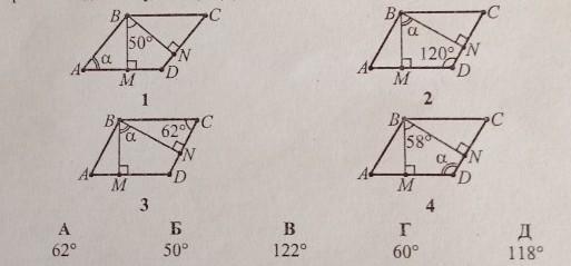 BM i BN- висоти паралелограма ABCD, проведені з вершини тупого кута. Установити вiдповiднiсть мiж рисунками (1-4) та градусними мi рами невідомих кутів а (А-Д).