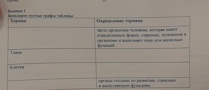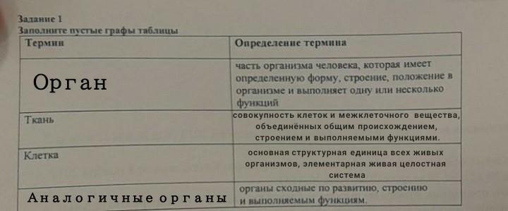 Задание 1 Заполните пустые графы таблицы Термин Ткань Клетка Определение термина часть организма человека, которая имеет определенную форму, строение, положение в организме и выполняет одну или несколько функций органы сходные по развитию, строению и выполняемым функциям.