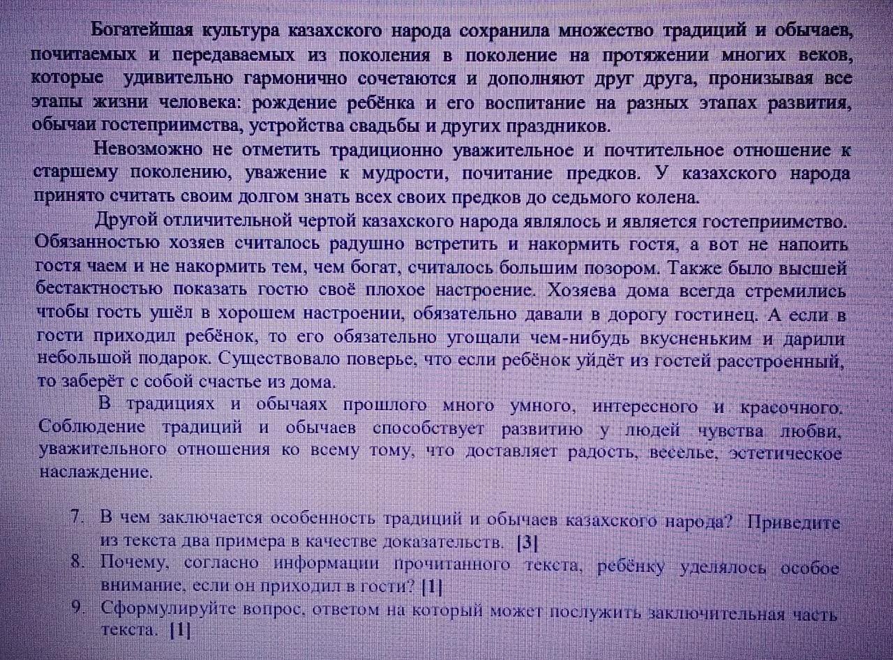 7. В чем заключается особенность традиций и обычаев казахского народа? Приведите из текста два примера в качестве доказательств. [3] 8. Почему, согласно информации прочитанного текста, ребенку уделялось особое внимание, если он приходил в гости? [1] 9. Сформулируйте вопрос. ответом на который может послужить заключительная часть текста. [1]