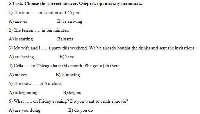 1.arrives 2.starts 3 are having. 4. Is moving. 5.begins 6. Are you doing.