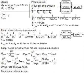 Електроплитка має три спіралі з опором 120 Ом кожна, які з'єднані паралельно одна до одної. Плитка вмикається в мережу послідовно з резистором, опір якого 20 Ом. Як зміниться час, необхідний для нагрівання на цій плитці чайника з водою до кипіння, якщо одна із спіралей перегорить?