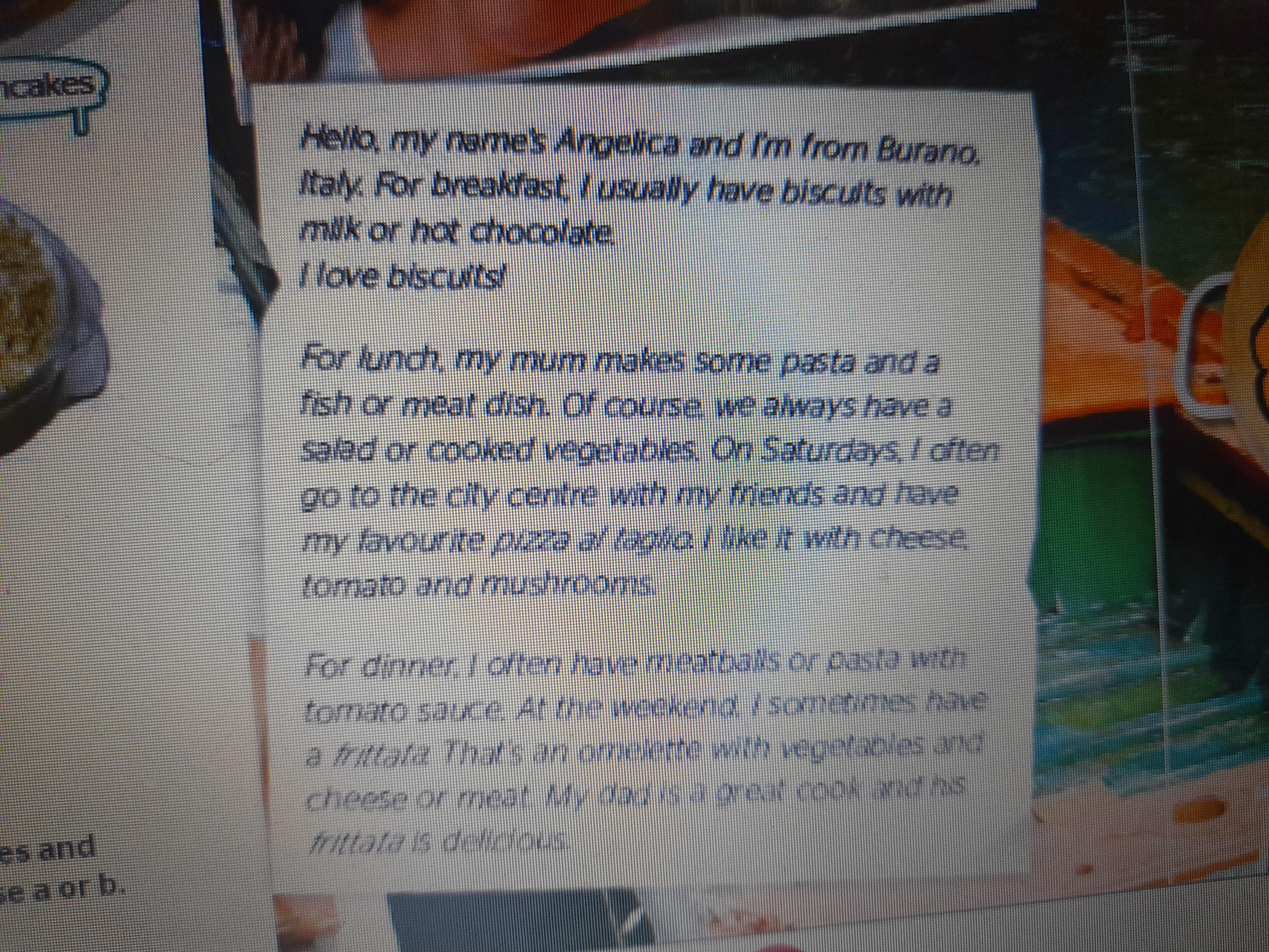 Перевод - Привет, мое имя Анджелика я из Бурано, Италия. На завтрак обычно у меня бисквит с гарячий шиколад с молоком. Я люблю бисвити!