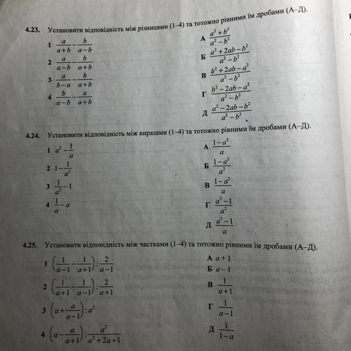 установіть відповідність між різницями(1-4) рівняннь та тотожно рівними їм дробами(А-Д)