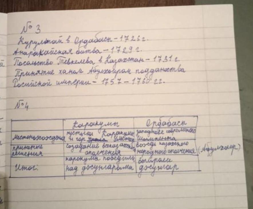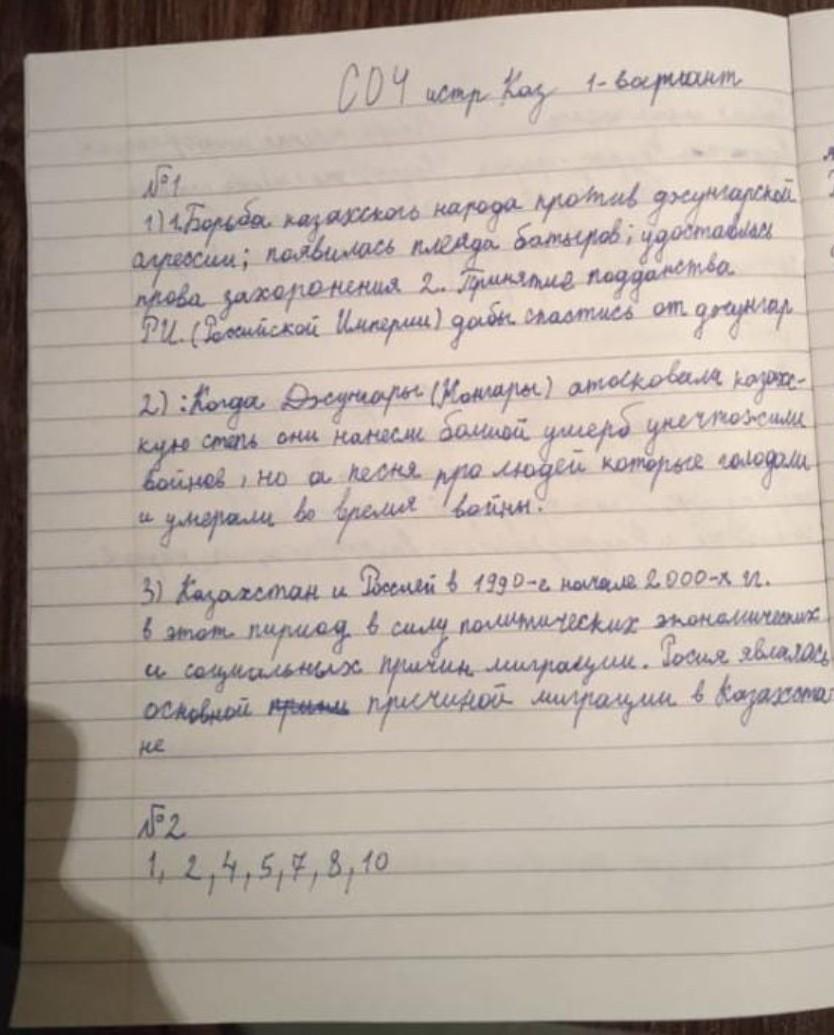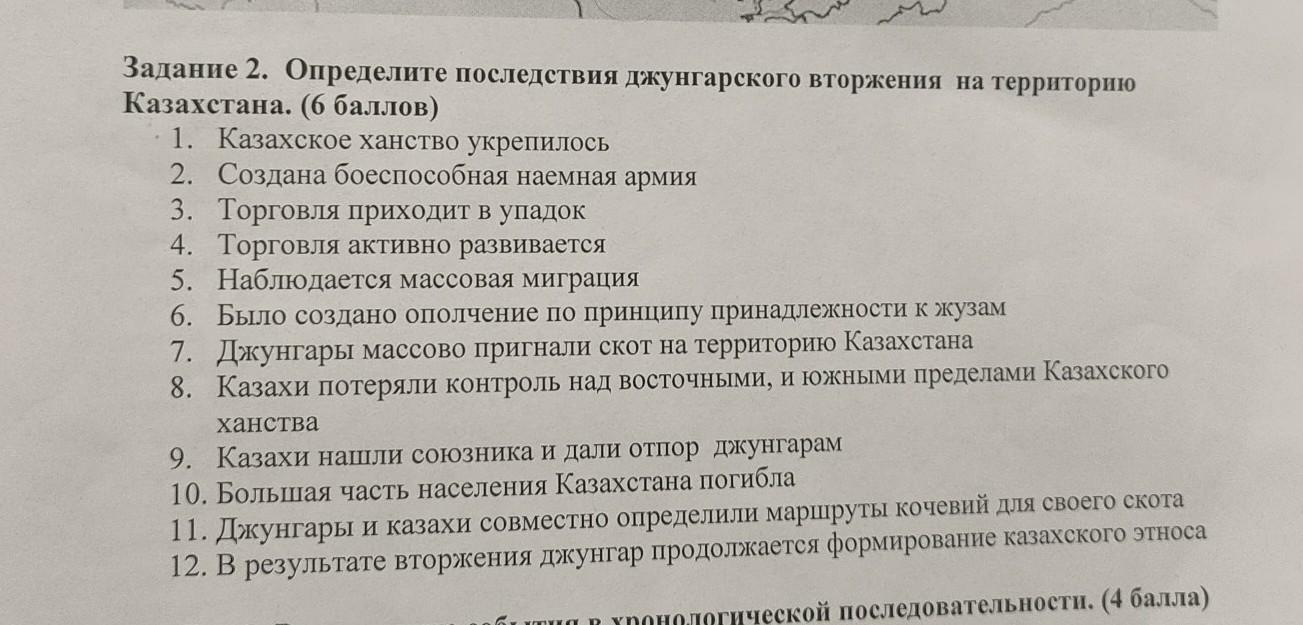 Задание 2. Определите последствия джунгарского вторжения на территорию Казахстана. (6 баллов) 1. Казахское ханство укрепилось 2. Создана боеспособная наемная армия 3. Торговля приходит в упадок 4. Торговля активно развивается 5. Наблюдается массовая миграция 6. Было создано ополчение по принципу принадлежности к жузам 7. Джунгары массово пригнали скот на территорию Казахстана 8. Казахи потеряли контроль над восточными, и южными пределами Казахского ханства 9. Казахи нашли союзника и дали отпор джунгарам 10. Большая часть населения Казахстана погибла 11. Джунгары и казахи совместно определили маршруты кочевий для своего скота 12. В результате вторжения джунгар продолжается формирование казахского этноса