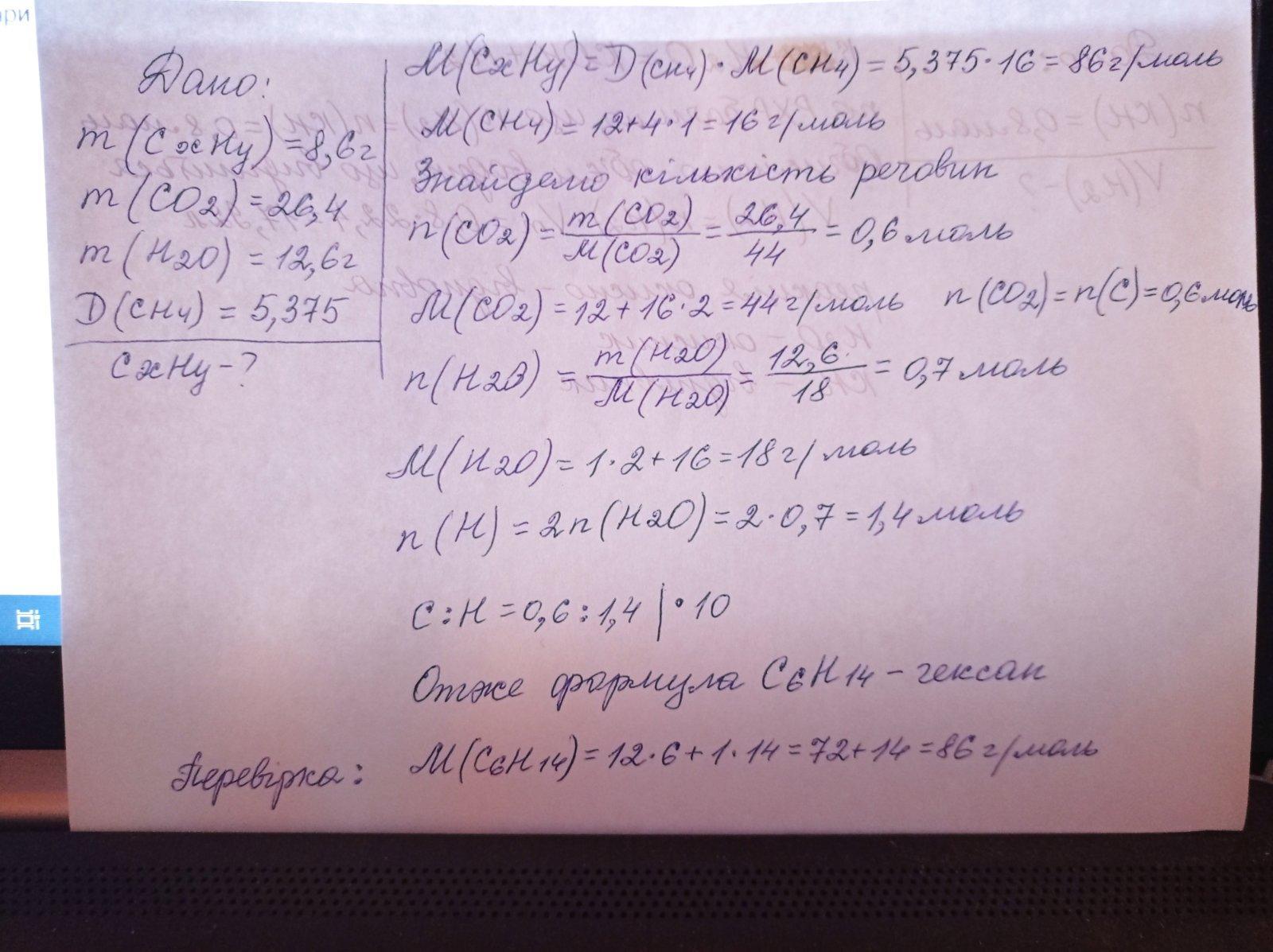 Спалили вуглеводень масою 8,6г. Утворився карбон (IV) оксид масою 26,4г і вода масою 12,6г. Густина пари вуглеводню за метаном - 5,375. Знайдіть молекулярну формулу сполуки