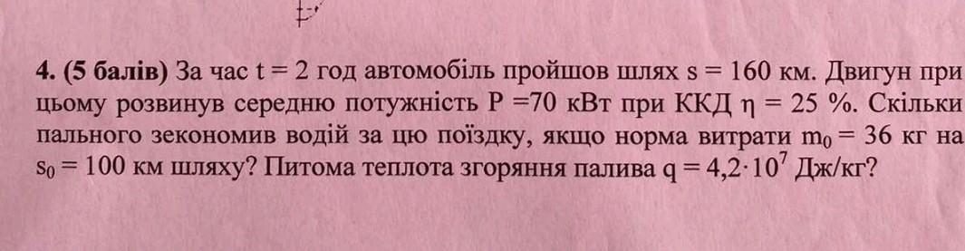 = 4. За час t = 2 год автомобіль пройшов шлях с = 160 км. Двигун пре цьому розвинув середню потужність Р =70 кВт при ККД п 25 %. Скільки пального зекономив водій за цю поїздку, якщо норма витрати мо - 36 кг на So=100 км шляху? Питома теплота згоряння палива q = 4,2-10' Дж/кг?