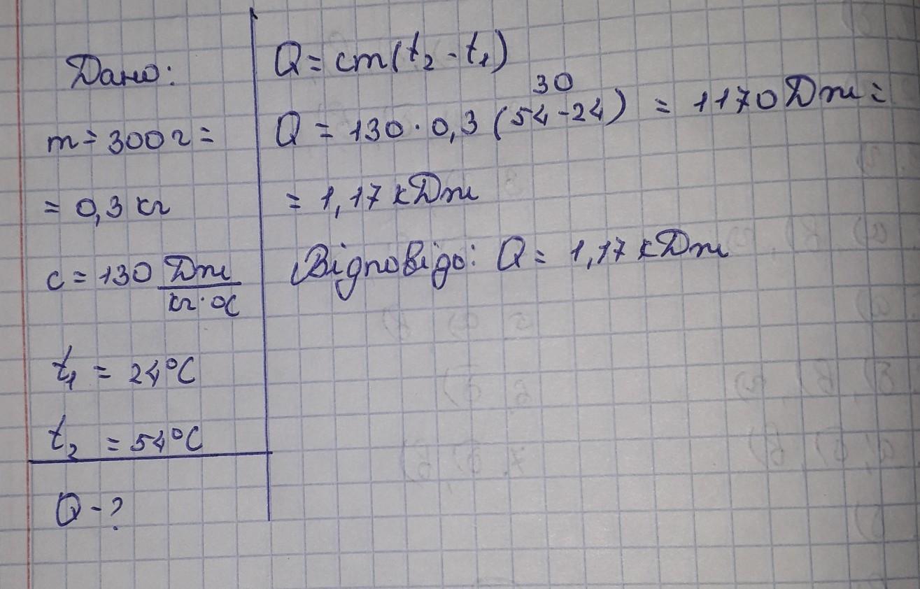 Q=cm(t2*t1) Q= 130*0.3(54-24)=1170Дж=1.17кДж