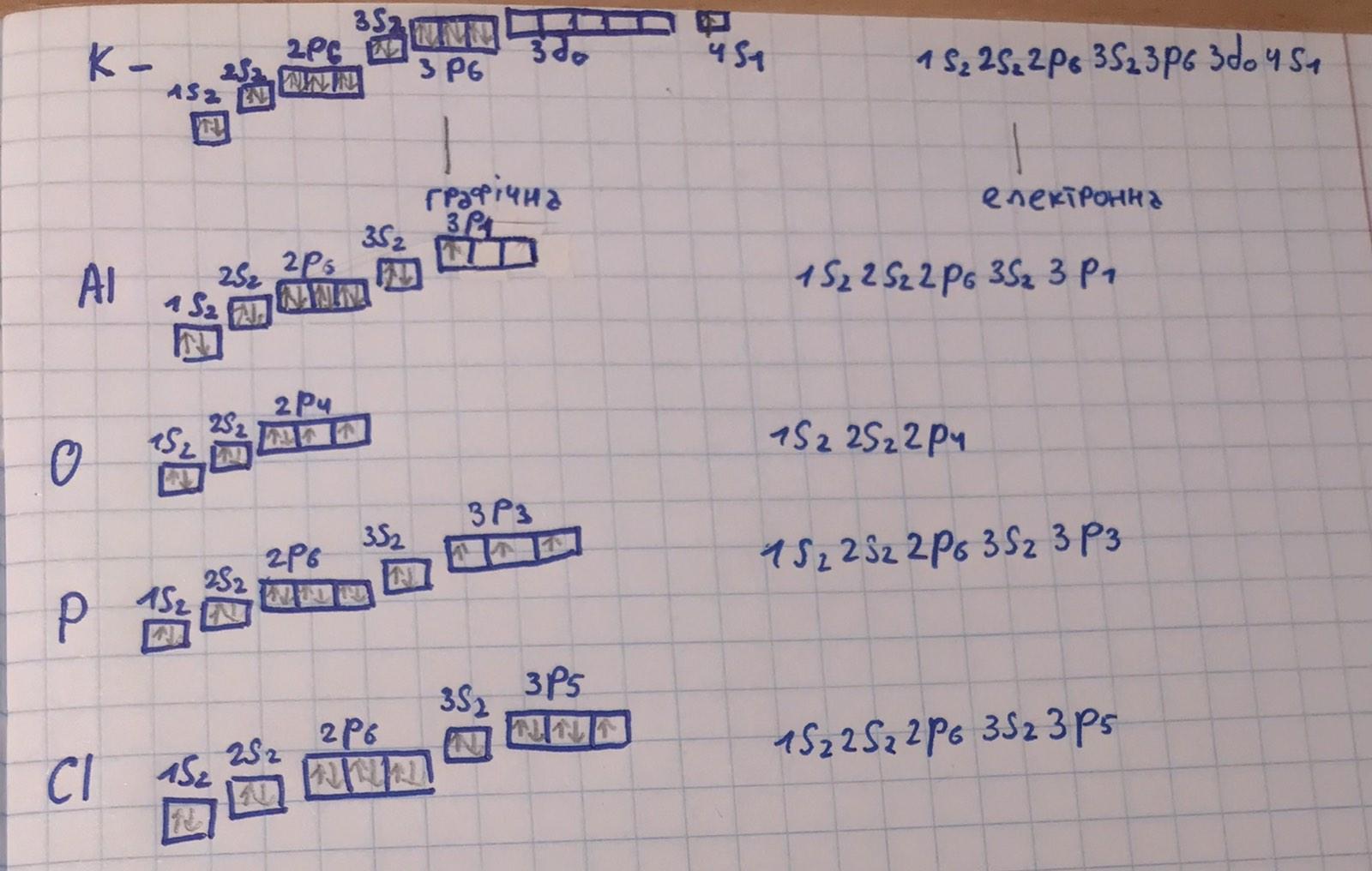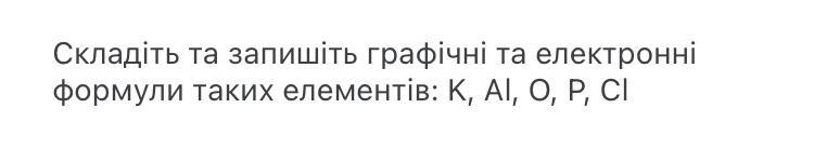 Складіть та запишіть графічні та електронні формули таких елементів:K,Al,O,P,CI