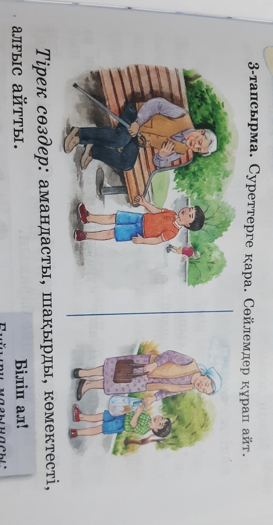 Айтайық. 3-тапсырма. Суреттерге қара. Сөйлемдер құрап айт. Тіреқ сөздер: амандасты,шақырды, көмектесті, алғыс айтты.