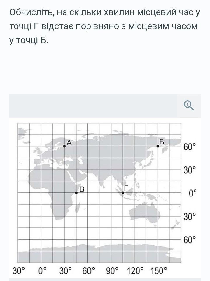 Точка Г має географічну довготу 105°, точка Б – 150°. Різниця: 150° – 105° = 45°. У часі це буде: 45° × 4 хв.