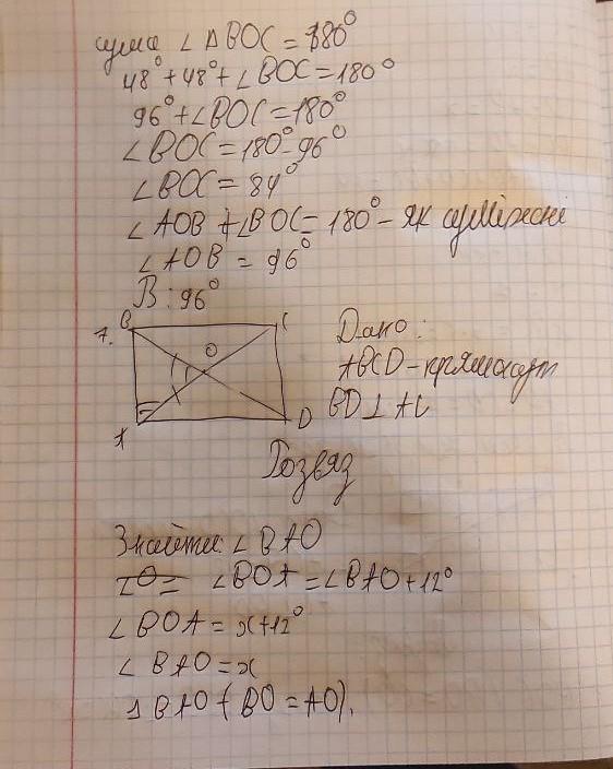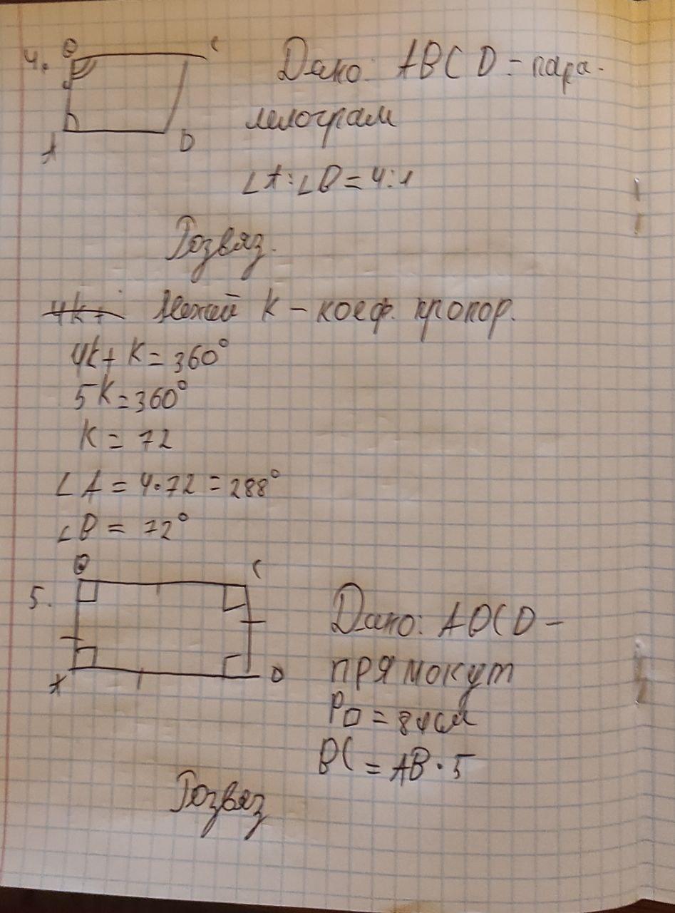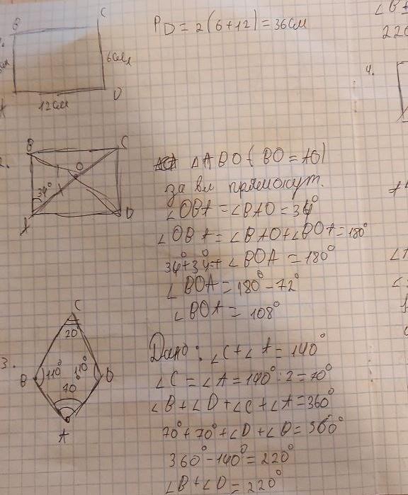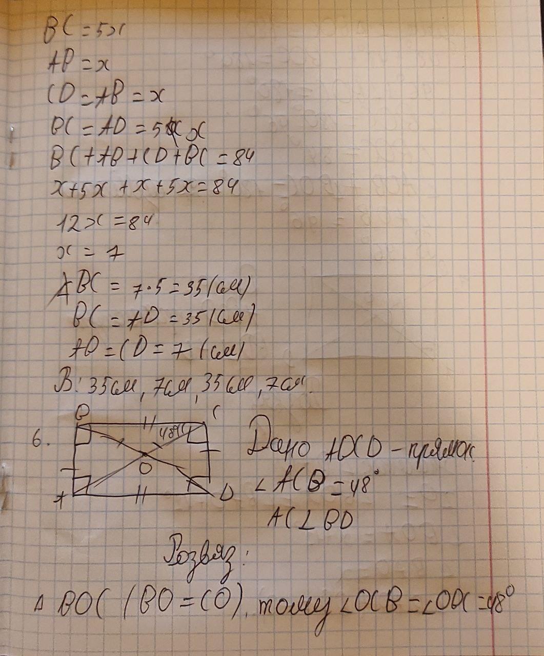 Контрольна робота 1. У чотирикутнику АВСД сторони АВ і СД паралельні. Знайдіть периметр чотирикутника, якщо AB = СД=6 см, АД= 12 см. 2. Чому дорівнюють кути між діагоналями прямокутника АВСД, якщо кут ВАС = 34°. 3. Сума двох кутів ромба дорівнює 140°. Знайдіть усі кути ромба. 4. Знайдіть кути паралелограма, якщо два з них відносяться як 4:1. 5. Периметр прямокутника 84 см, а одна зі сторін у 5 рази більша від другої. Знайдіть сторони прямокутника. 6. У прямокутнику АВСД кут АCB дорівнює 48°. Знайдіть більший кут між діагоналями прямокутника. 7. Знайдіть кут між меншою стороною і діагоналлю прямокутника, якщо він на 12° менший від кута мiж діагоналями, який лежить проти меншої сторони. ДАМ 20 БАЛОВ