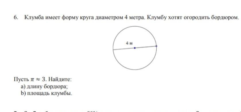 6. Клумба имеет форму круга диаметром 4 метра. Клумбу хотят огородить бордюром. Пусть п≈ 3. Найдите: а) длину бордюра; b) площадь клумбы. 4 м [I 131