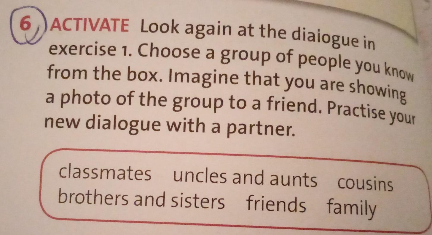 Activate look again at the dialogue in exercise 1. Choose a group of people you know from the box. Imagine that you are snowing a photo of the group to a friend practise your new dialogue with a partner