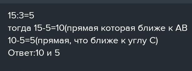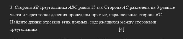 3. Сторона AB треугольника АВС равна 15 см. Сторона АС разделена на 3 равные части и через точки деления проведены прямые, параллельные стороне ВС. Найдите длины отрезков этих прямых, содержащихся между сторонами треугольника.