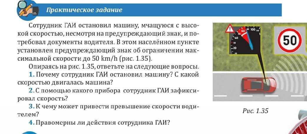 Сотрудник ГАИ остановил машину, мчащуюся с высо- кой скоростью, несмотря на предупреждающий знак, и по- требовал документы водителя. В этом населённом пункте установлен предупреждающий знак об ограничении мак- симальной скорости до 50 km/h (рис. 1.35). Опираясь на рис. 1.35, ответьте на следующие вопросы. 1. Почему сотрудник ГАИ остановил машину?